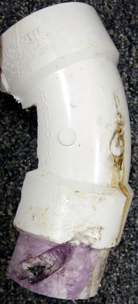 I repaired the gash on the side of the pipe, but noticed on re-inspection that water was still slowly dripping from parts unknown. It was apparent that the water was coming from elsewhere and I needed to remove the fitting to find the breach. Because of space limitations, if I simply cut the fitting off, I would not be left with enough pipe to attach a new elbow. This meant I would have to open the wall and splice in a longer piece of pipe. That's a lot more work than I wanted to do.